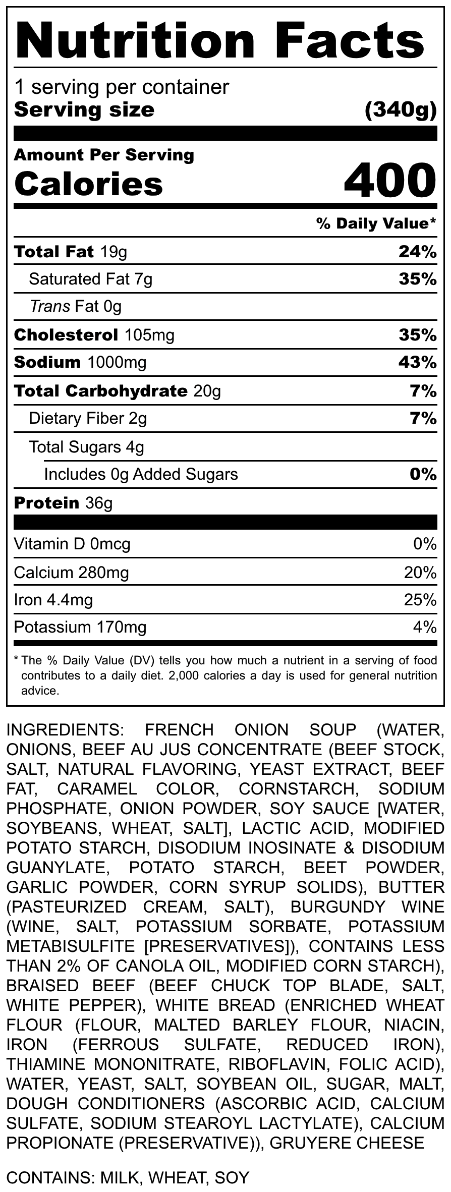 Ingredients: French Onion Soup (WATER, ONIONS, BEEF AU JUS CONCENTRATE (BEEF STOCK, SALT, NATURAL FLAVORING, YEAST EXTRACT, BEEF FAT, CARAMEL COLOR, CORNSTARCH, SODIUM PHOSPHATE, ONION POWDER, SOY SAUCE [WATER, SOYBEANS, WHEAT, SALT], LACTIC ACID, MODIFIED POTATO STARCH, DISODIUM INOSINATE & DISODIUM GUANYLATE, POTATO STARCH, BEET POWDER, GARLIC POWDER, CORN SYRUP SOLIDS), BUTTER (PASTEURIZED CREAM, SALT), BURGUNDY WINE (WINE, SALT, POTASSIUM SORBATE, POTASSIUM METABISULFITE [PRESERVATIVES]), Eye Round Beef, Italian Bread (Enriched Wheat Flour (Flour, Malted Barley Flour, Niacin, Iron (Ferrous Sulfate, Reduced Iron), Thiamine Mononitrate, Riboflavin, Folic Acid), Water, Yeast, Salt, Soybean Oil, Sugar, Malt, Dough Conditioners (Ascorbic Acid, Calcium Sulfate, Sodium Stearoyl Lactylate), Calcium Propionate (Preservative)), Low Fat Swiss Cheese, Parsley