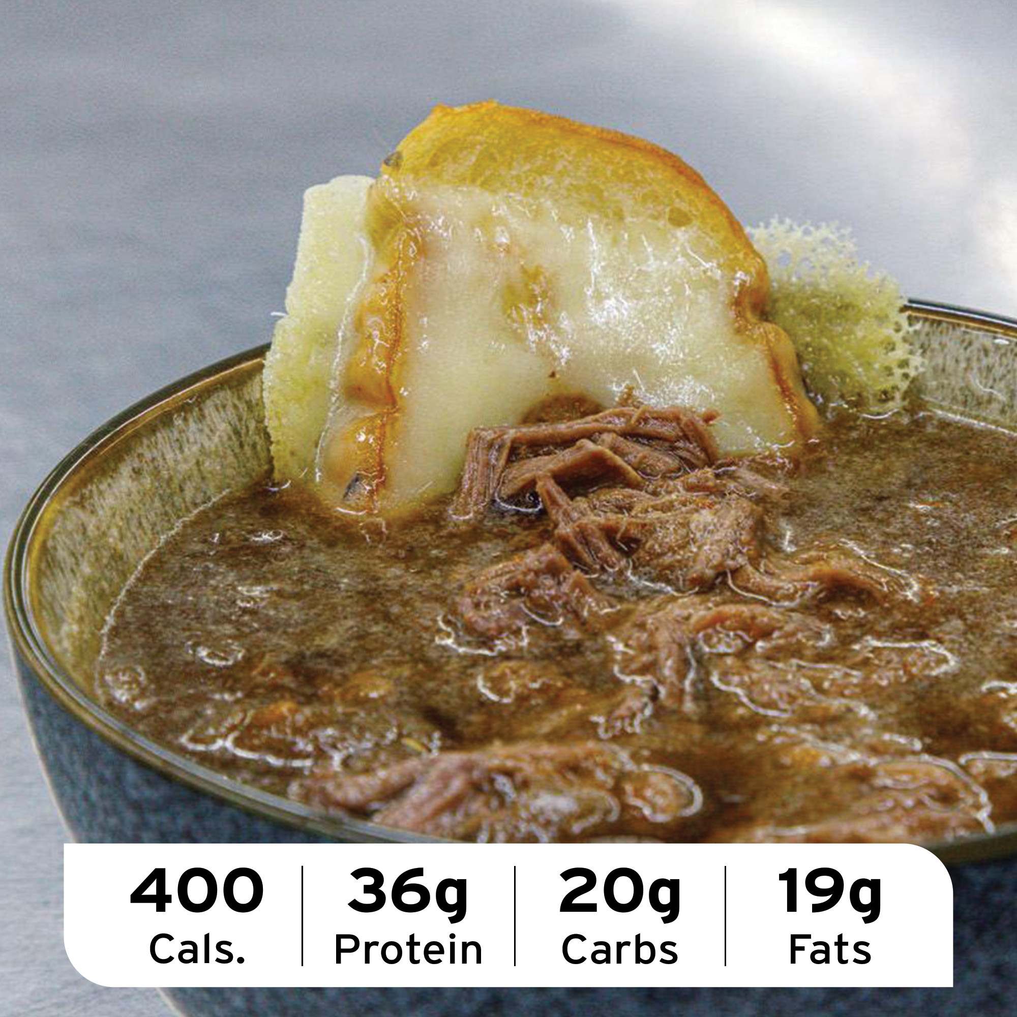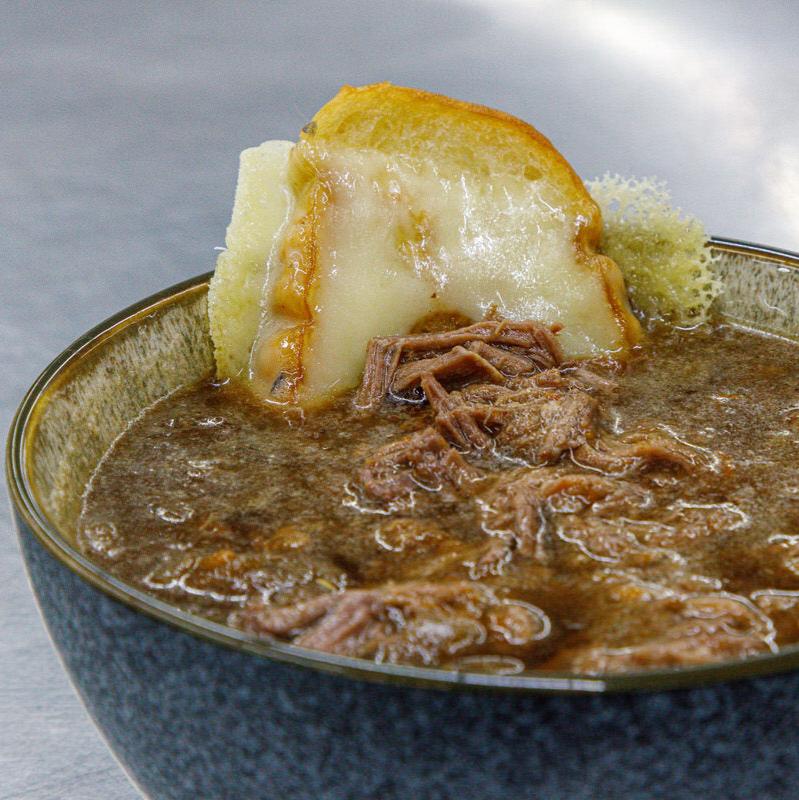 Indulge in our savory French Onion Soup with tender, slow-cooked beef, Italian bread, and melted Swiss cheese. This gourmet version of a classic pub dish is high in protein and guaranteed to delight your taste buds.