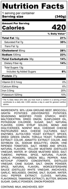 INGREDIENTS: 90% LEAN GROUND BEEF, BROCCOLI, GRATIN POTATOES (DEHYDRATED POTATOES, SEASONING MODIFIED FOOD STARCH, WHEY, MALTODEXTRIN, DRIED ONION, SUNFLOWER OIL, POTASSIUM CHLORIDE, SUGAR, SALT, NATURAL FLAVORS, CORN SYRUP SOLIDS, MONO AND DIGLYCERIDES, NONFAT MILK, CHEDDAR CHEESE PASTEURIZED MILK, CHEESE CULTURES, SALT, ENZYMES, AUTOLYZED YEAST EXTRACT, SPICES, DRIED GREEN ONION, TORULA YEAST, TURMERIC EXTRACT COLOR, ANNATTO EXTRACT COLOR, AND SOYBEAN OIL, SODIUM BISULFITE), ONION, VINE RIPENED TOMATOES, SALT, HERBS AND SPICES, NATURAL FLAVORS, YELLOW MUSTARD (DISTILLED VINEGAR, WATER, #1 GRADE MUSTARD SEED, SALT, TUMERIC, PAPRIKA, SPICE, NATURAL FLAVOR, GARLIC POWDER), GREEN BELL PEPPER, RAW, KETCHUP (TOMATO CONCENTRATE, DISTILLED VINEGAR, CANE SUGAR, SALT, ONION POWDER, SPICE, NATURAL FLAVOR), WORCESTERSHIRE SAUCE (DISTILLED WHITE VINEGAR, ANCHOVIES, GARLIC, MOLASSES, ONIONS, SALT, SUGAR, WATER, CHILI PEPPER EXTRACT, CLOVES, NATURAL FLAVORINGS, TAMARIND EXTRACT), BUTTER, BROWN SUGAR, GARLIC POWDER, ONION POWDER