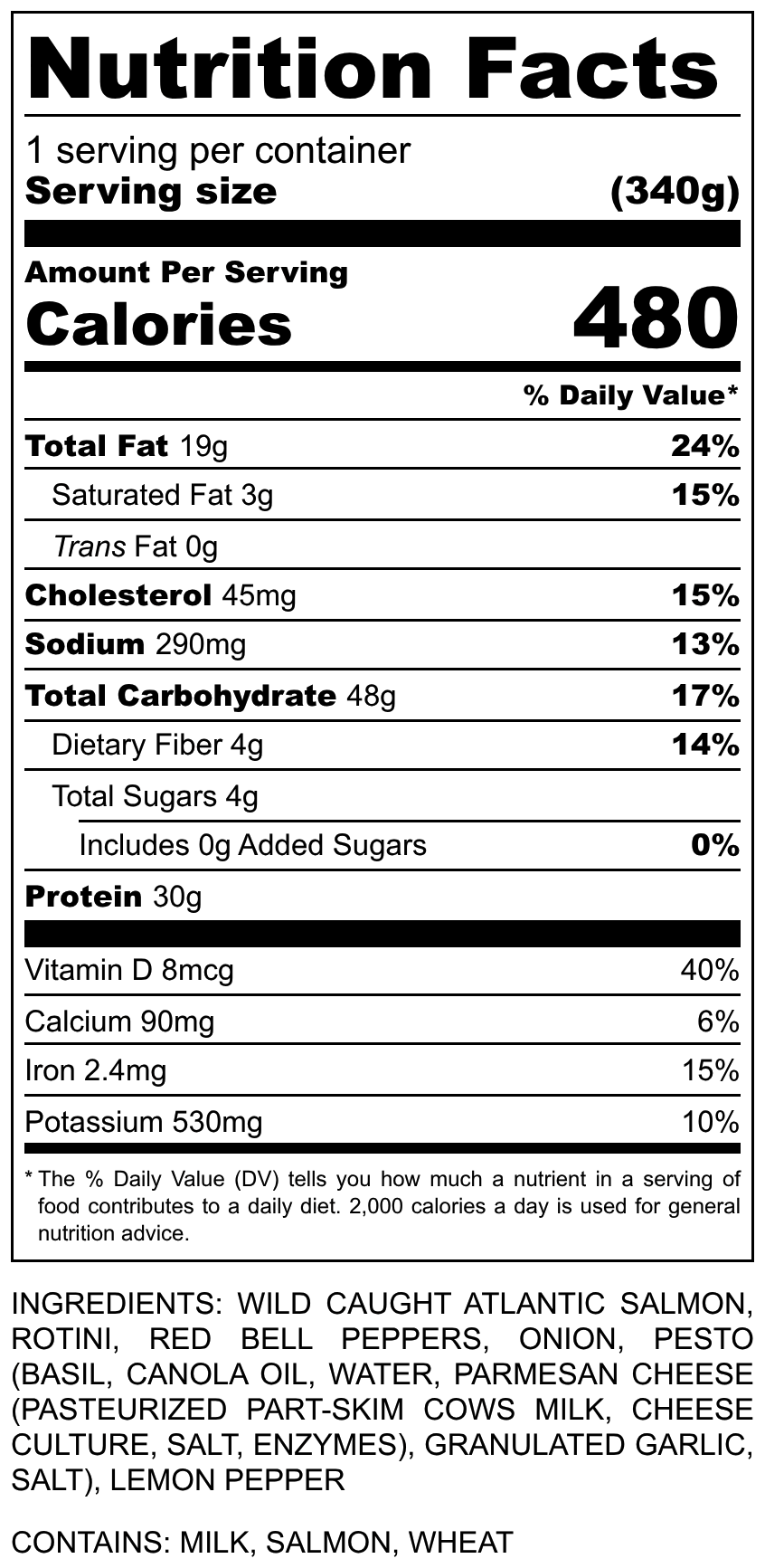 Seared Fish over spiral rotini pasta with peppers and onions and a light Basil Pesto sauce. This fish is Sushi Grade and is slightly undercooked and is designed to finish cooking in the microwave for a tender and flaky finish. If desired, you can add more time to get the fish done to your liking. This meal can be made better by some pausing and stirring during reheating.